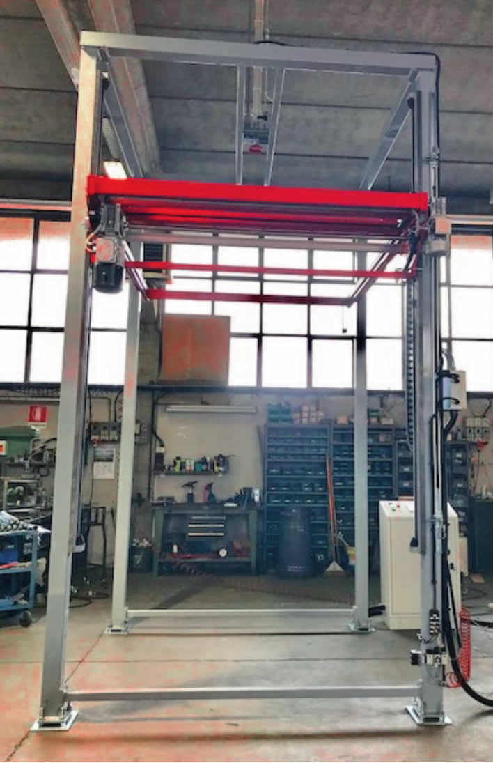 Automatic dust-proof pallet top cover with independent structure. It can be easily installed on existing wrapping lines. The independent structure also allows for increased production capacity. The top cover operation is performed on the motorized roller conveyor located at the entrance to the fully automatic wrapping machine. In this situation, we will always have a pallet waiting, ready for wrapping.